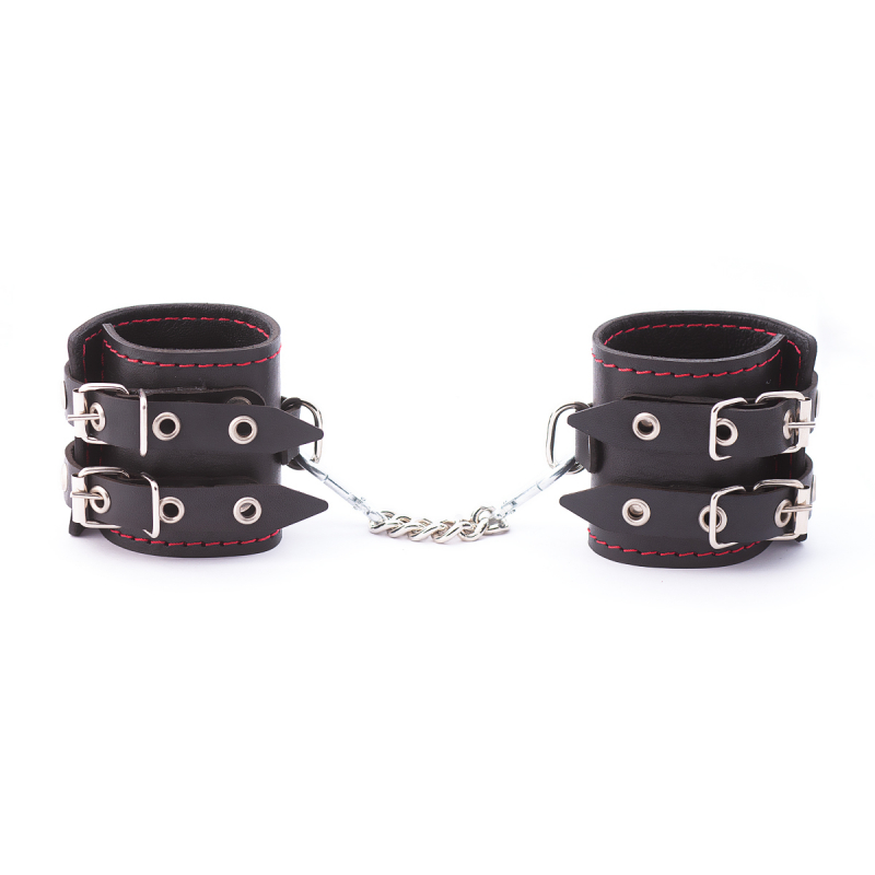 Выполнены оковы из натуральной кожи в черном цвете и декорированы красной строчкой и металлическими клепками