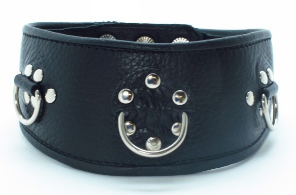 Ошейник декорирован металлическими клепками и имеет 3 кольца, к которым Вы можете крепить любые девайсы!