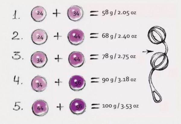 Разный вес шариков - 24, 34, 44, 56г позволяют проводить тренировку постепенно увеличивая нагрузку, что приводит к потрясающим результатам! Кроме того, добившись определенных результатов, Вы сможете использовать шарики самостоятельно, без сцепки, а это уже уровень настоящей Гейши!